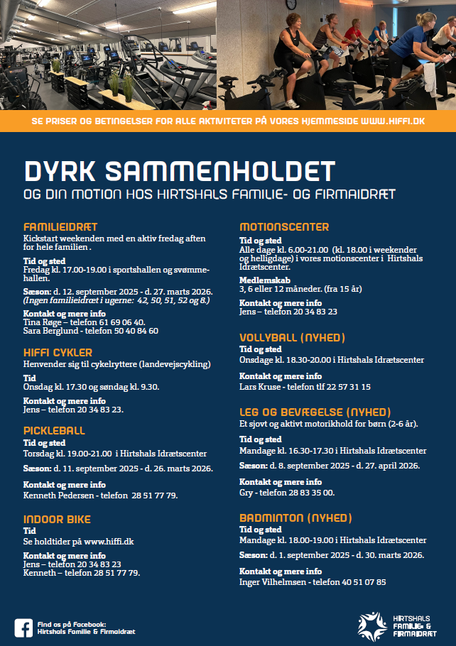 Hirtshals Familie- & Firmaidræt tilbyder mange forskellige motionsformer bl.a. :